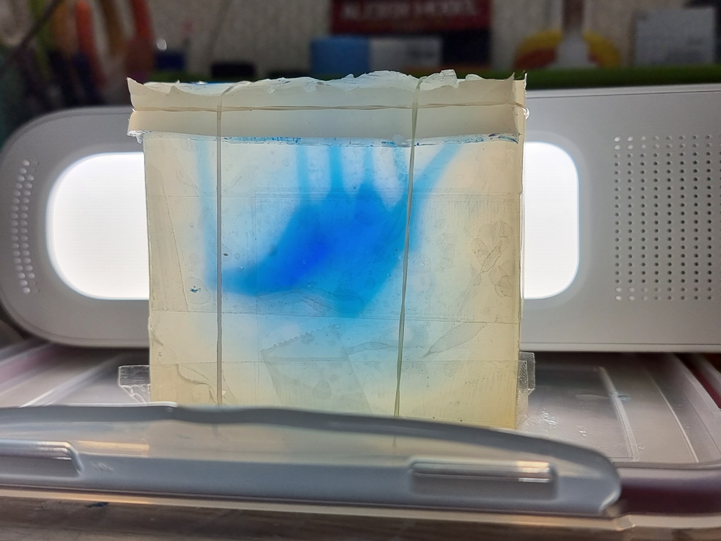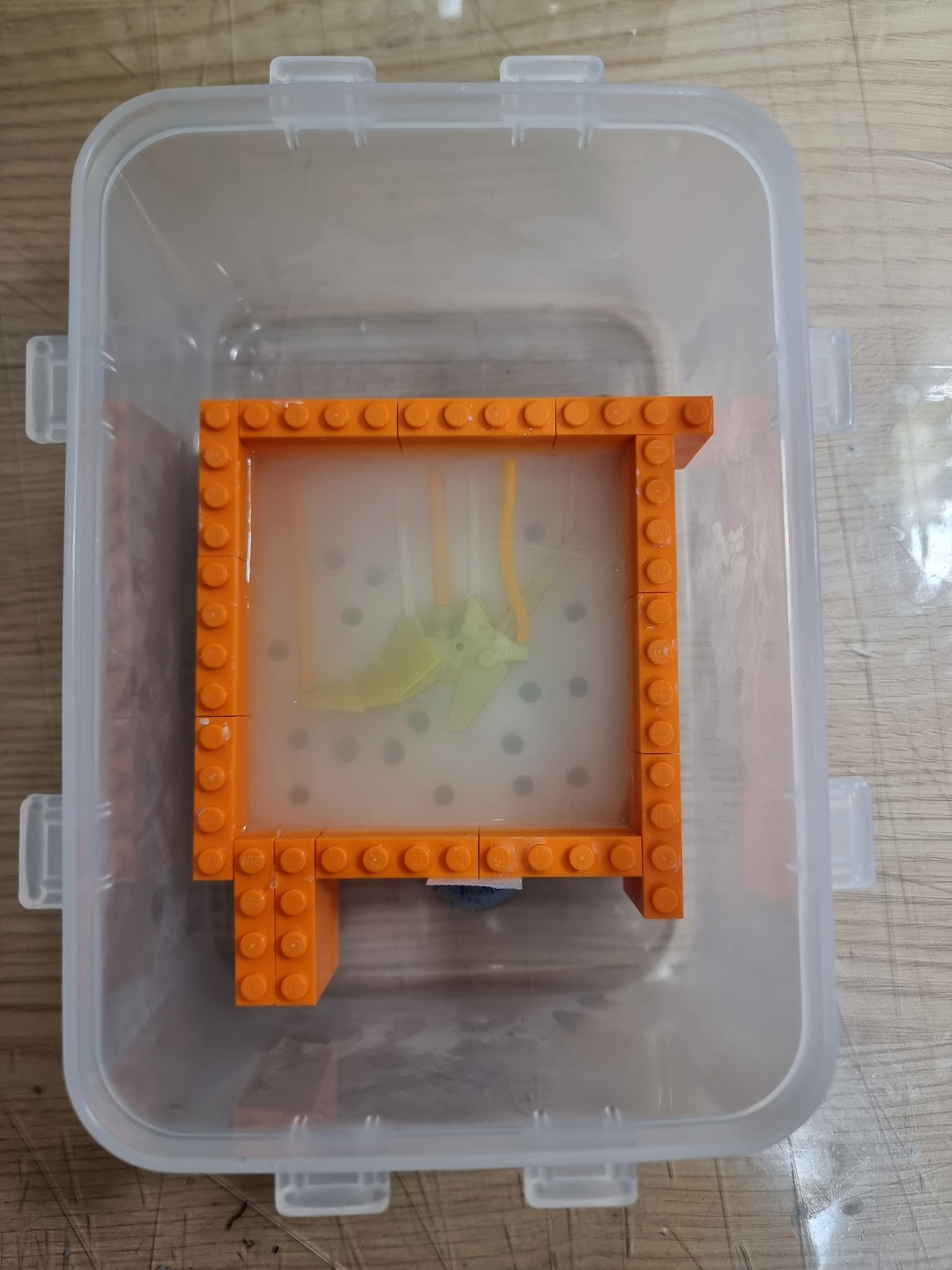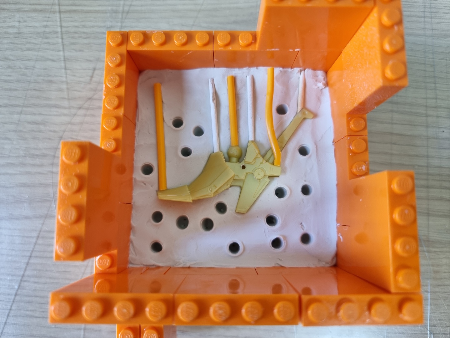 중간 과정이 생략되었지만, 위 이미지에서 경화가 완료된 후 레고 거푸집에서 꺼내어 밑에 깔았던 유토 제거 후 뒤집은 채 거푸집을 다시 세워 이형제를 도포했습니다. 이형제 없이는 양쪽 실리콘이 한덩어리가 되어버립니다.
