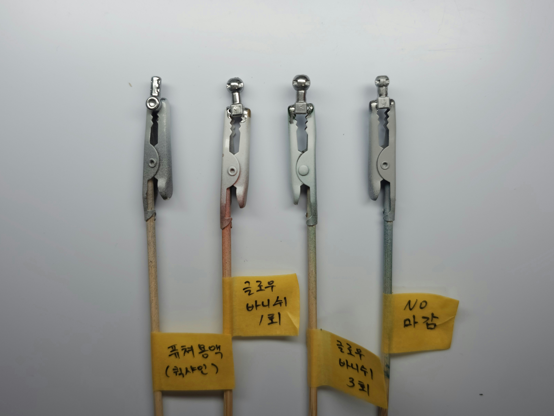 이제 퓨쳐용액, 글로우 바니시 1회, 글로우 바니시 3회 도포 시편 순서로 동일하게 각 10여회씩 문질러 보겠습니다.