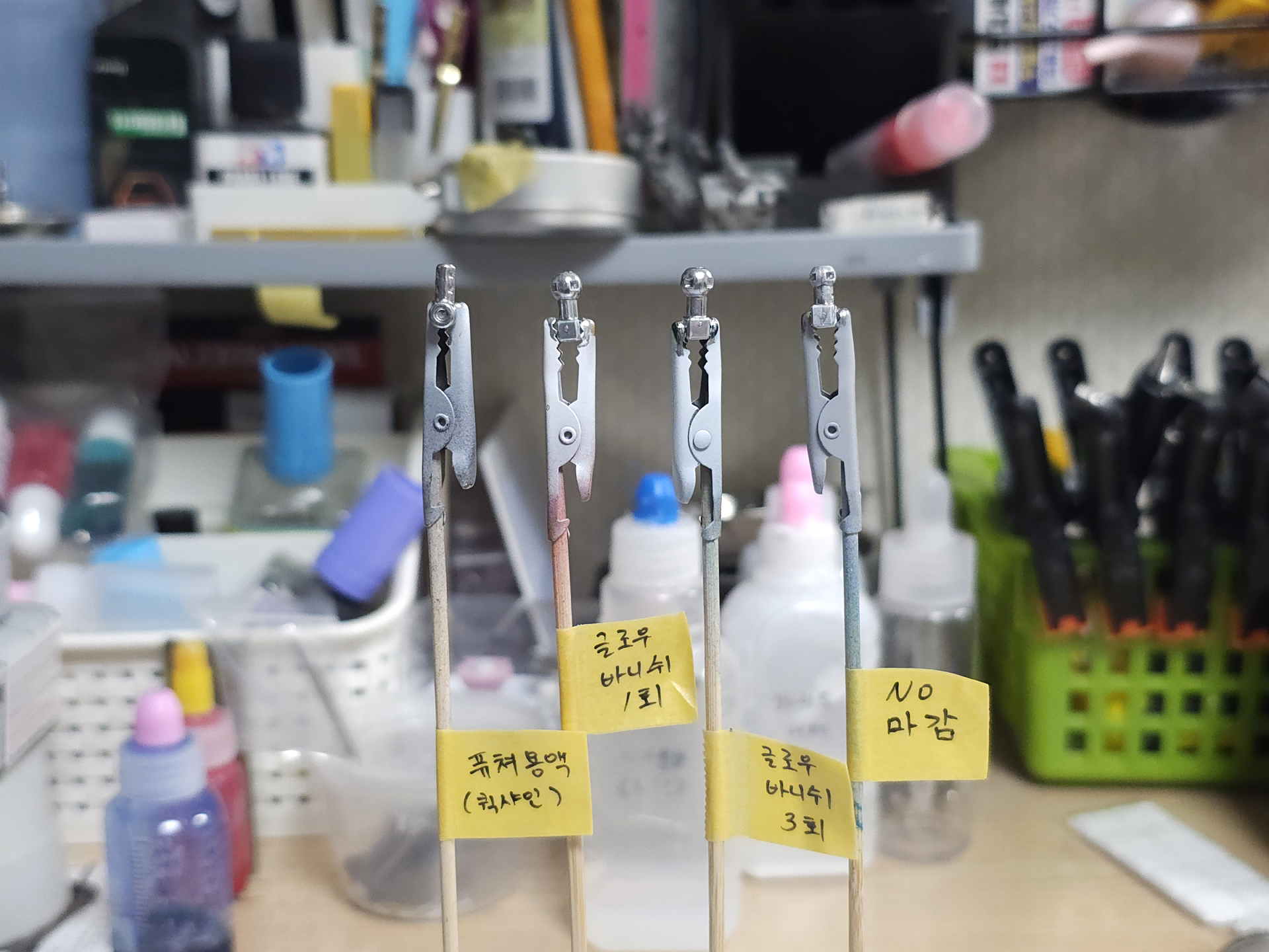 어찌됐든, 결국 모형에 적용하기 위한 도색이며 가동을 위해서든 전시를 위해서든 한번 이상은 반드시 손으로 만지게 될 터.. 광을 유지시켜줄 마감이 필요했습니다.