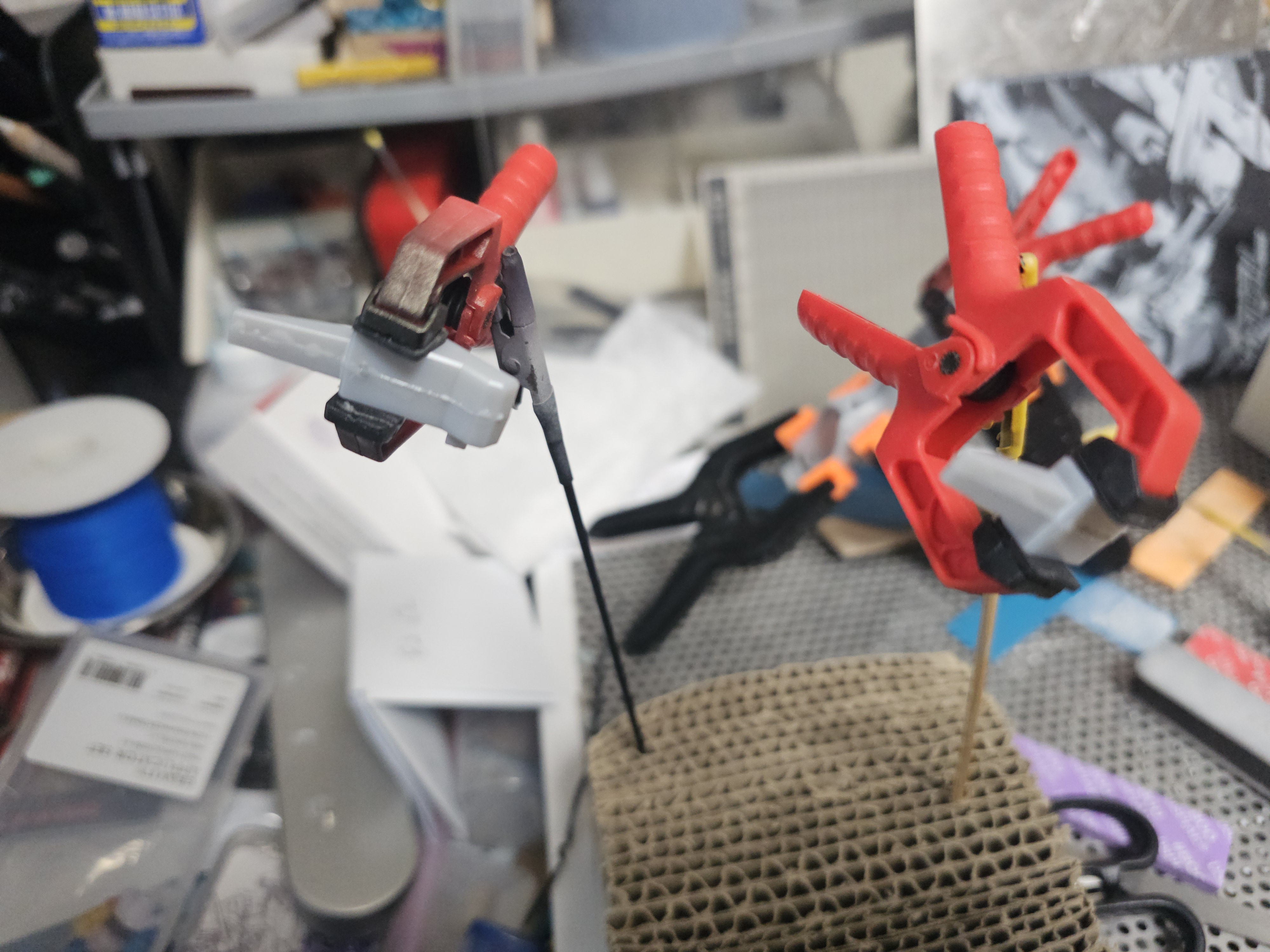 접착 경화 완료된 파츠를 사포질 하여 접합선 제거. (패널라인은 아직 작업 전)동체 접합선 수정 위해 무수지접착제 후 클램프로 물려놓음마찬가지로 좌우접합인 테일 스테빌라이저도 접합선 수정 위해 접착동체 사포질 완료 / 좌측 테일 스테빌라이저 사포질 완료 / 우측 테일스테빌라이저 사포질 전 (촬영 후 완료)