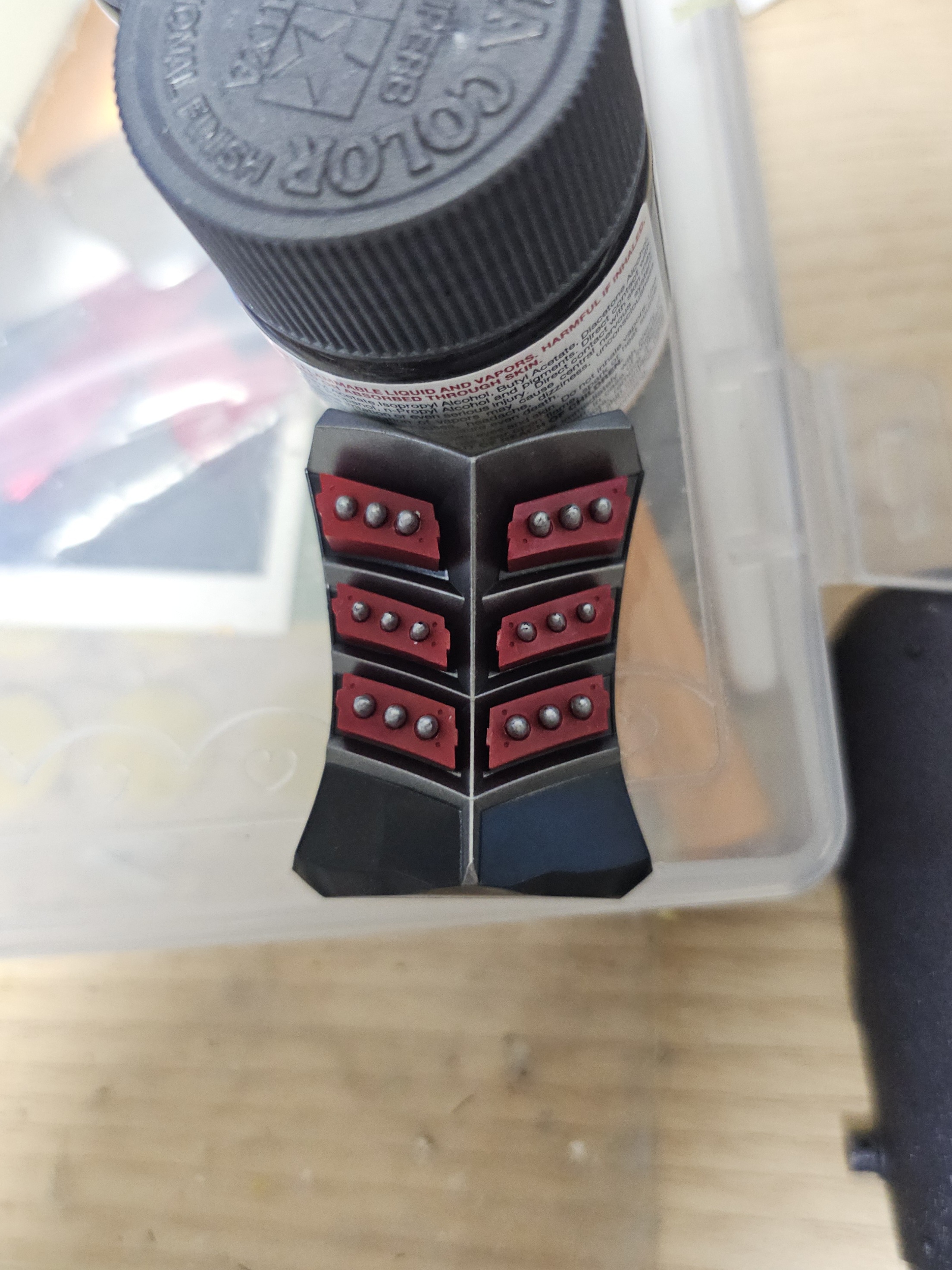 브라이트 실버 도포한번 뽑아보고 도막이 긁혀나가는걸 확인하여 팔 하박 안쪽을 갈아내고 스트라이크 파일에 슈퍼클리어를 두겹으로 올려주었습니다미사일 파티 부분도색. 빨간색 부품을 끼우며 많이 까져서 이후 다시한번 덧칠했습니다.골드 파츠 도색블랙 위에 브라이트 실버 부분도색을 위한 마스킹. 서클커터는 이럴때 빛을 발하지요소체 전반의 기본색상 도색 완료캐논파티 + 미사일 파티 장착모비딕 앵커 구현부분 부분 빨간색 포인트 도색가슴 중앙 디테일 파츠 안쪽에는 메쉬망을 넣어 디테일 업 했습니다.