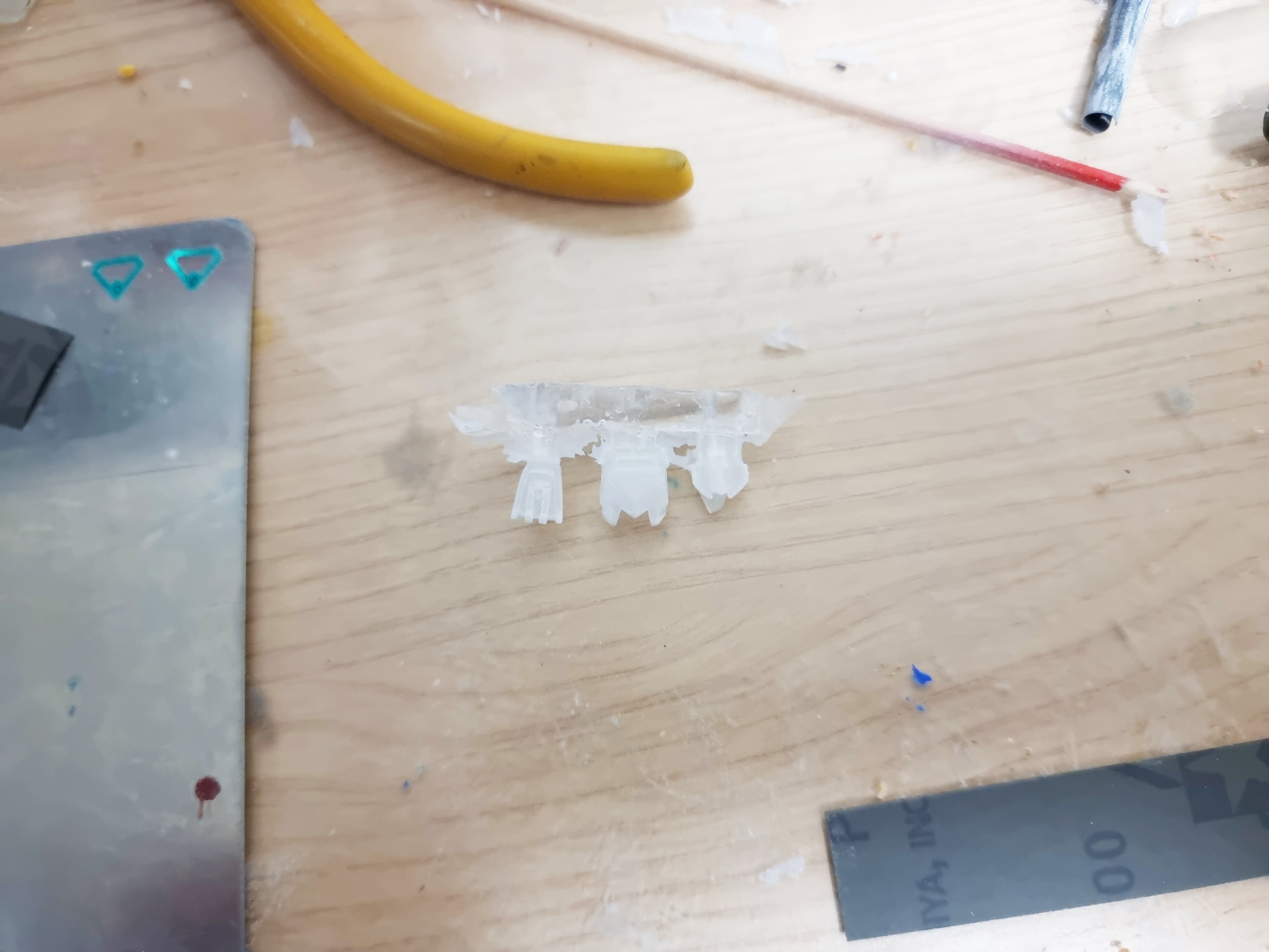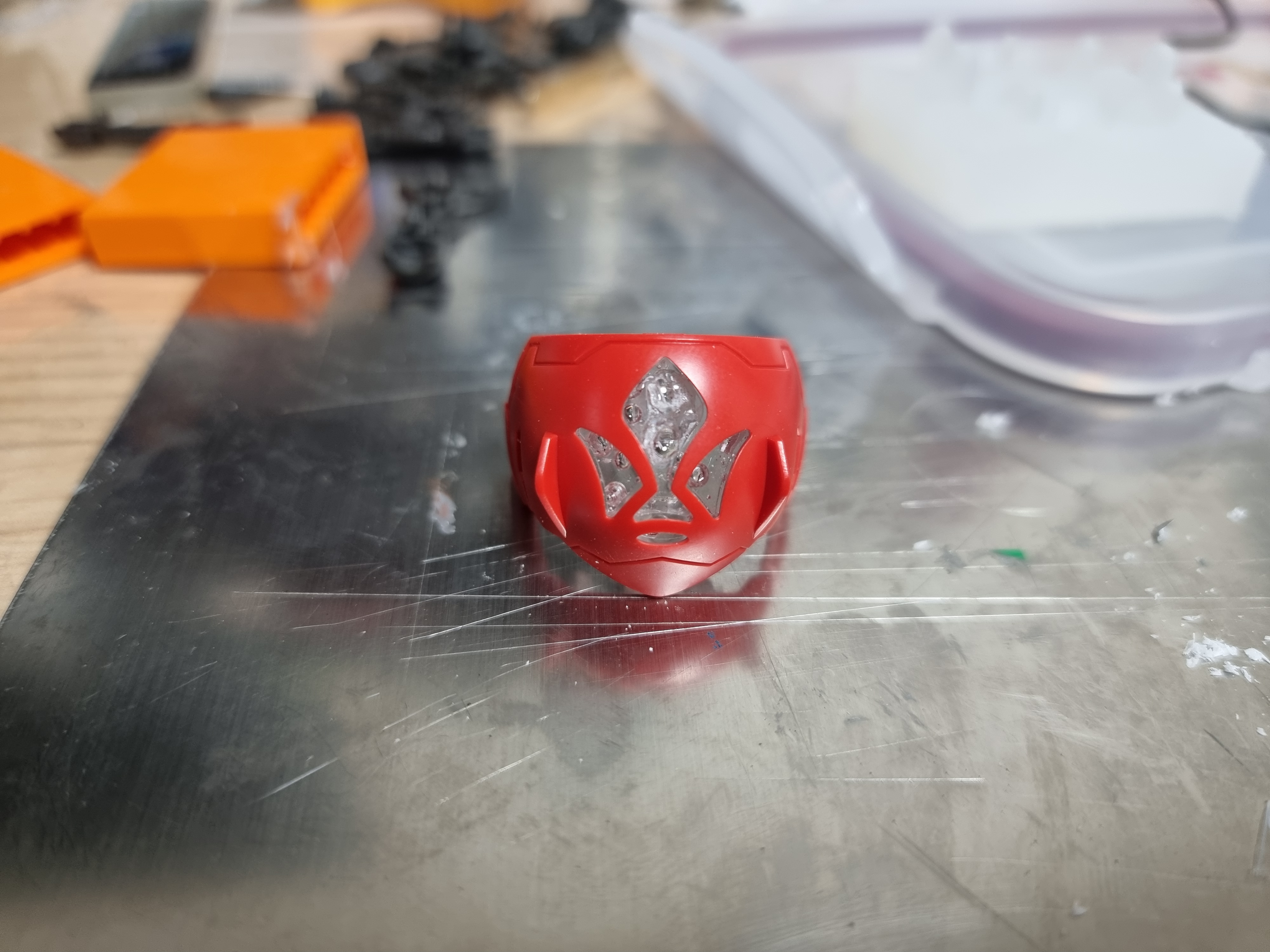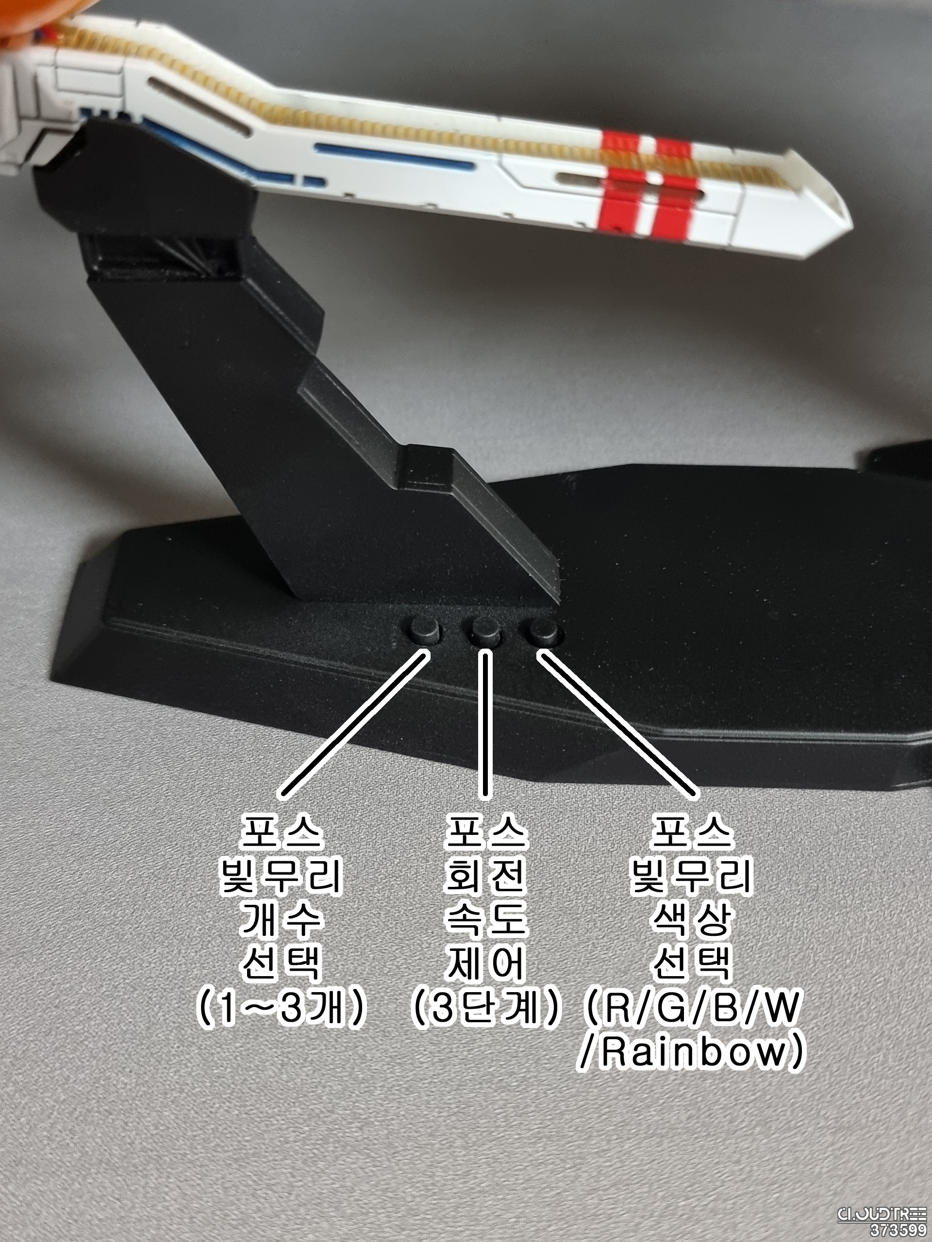 사용한 색상은 베이스 화이트, 라이트 그레이, 라이트 건메탈, 메탈릭 블루, 샤인레드, 옐로우 골드 입니다.기체 마감은 폴리우레탄 계열인 조소냐 글로우 바니쉬이며, 베이스만 무광 슈퍼클리어를 사용했습니다.데칼은 직접 제작한 자작데칼 및 델피데칼의 범용 코션 데칼을 사용했습니다.동체와 파동포 등 몇몇 포인트에 녹색 메탈테이프를 재단하여 적용했습니다.파일럿의 경우 아크릴 도료를 사용해 붓도색 하였습니다.완전 자작한 두개의 비트입니다. 1.6mm x 0.8mm 칩 LED를 적용하였습니다.본체 버니어에 블루 LED 5개, 콕핏에 RGB LED, 포스에 33개의 네오픽셀 스트립LED를 사용했습니다.외부전원 외에 모든 전선을 베이스에 수납하고 숨기려 노력했지만, 비트의 전원선은 어쩔 수 없이 노출되었네요.베이스에는 3개의 버튼이 있으며, 각 버튼의 용도는 위와 같습니다.
