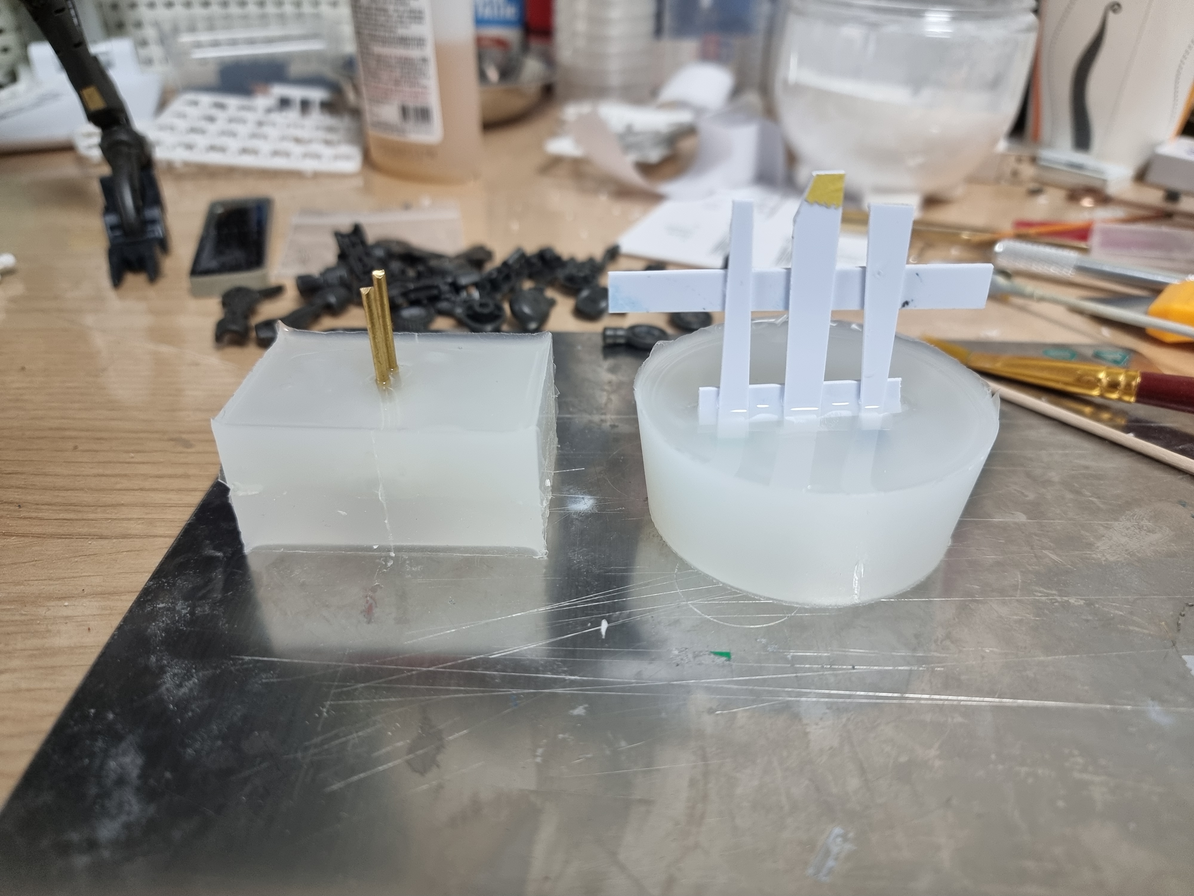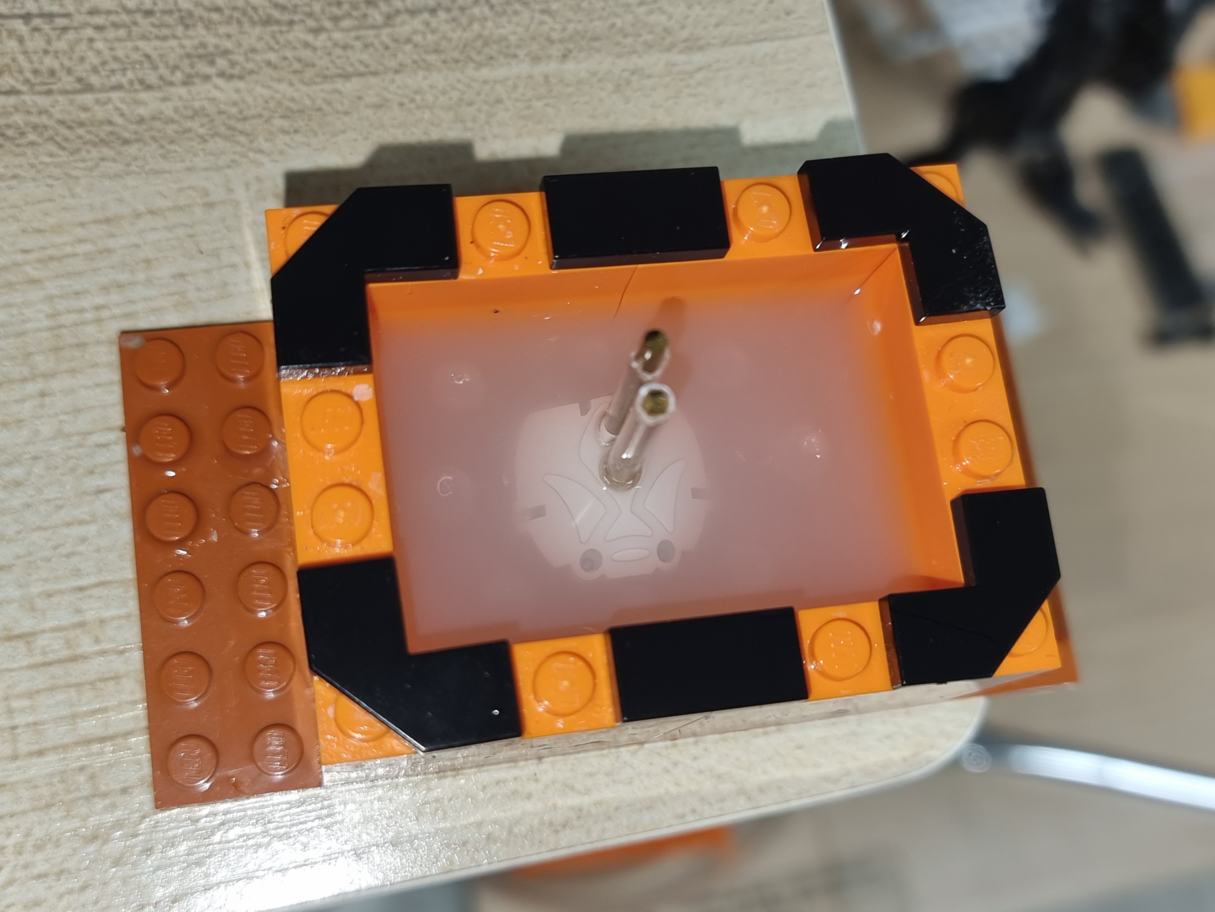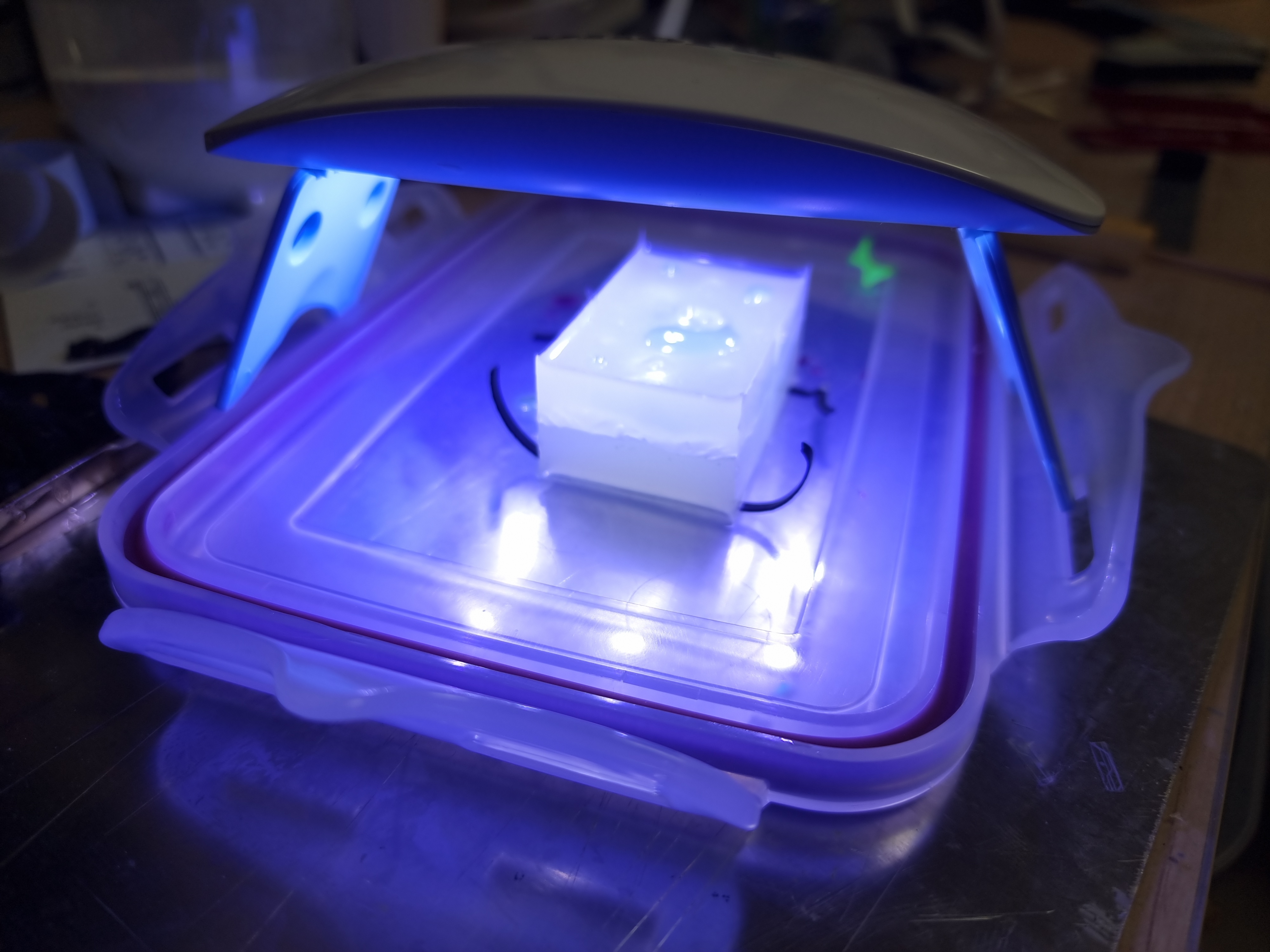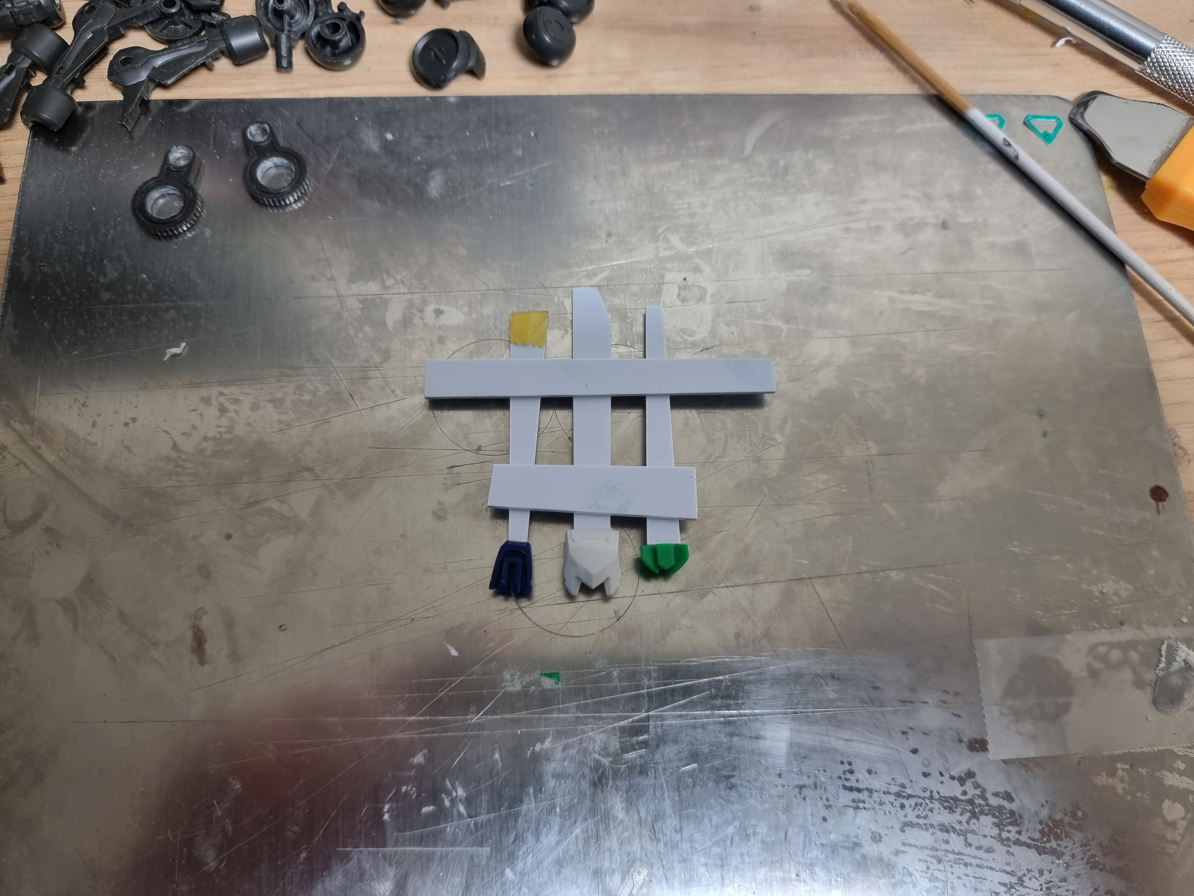 사용한 색상은 베이스 화이트, 라이트 그레이, 라이트 건메탈, 메탈릭 블루, 샤인레드, 옐로우 골드 입니다.기체 마감은 폴리우레탄 계열인 조소냐 글로우 바니쉬이며, 베이스만 무광 슈퍼클리어를 사용했습니다.데칼은 직접 제작한 자작데칼 및 델피데칼의 범용 코션 데칼을 사용했습니다.동체와 파동포 등 몇몇 포인트에 녹색 메탈테이프를 재단하여 적용했습니다.파일럿의 경우 아크릴 도료를 사용해 붓도색 하였습니다.완전 자작한 두개의 비트입니다. 1.6mm x 0.8mm 칩 LED를 적용하였습니다.본체 버니어에 블루 LED 5개, 콕핏에 RGB LED, 포스에 33개의 네오픽셀 스트립LED를 사용했습니다.외부전원 외에 모든 전선을 베이스에 수납하고 숨기려 노력했지만, 비트의 전원선은 어쩔 수 없이 노출되었네요.베이스에는 3개의 버튼이 있으며, 각 버튼의 용도는 위와 같습니다.