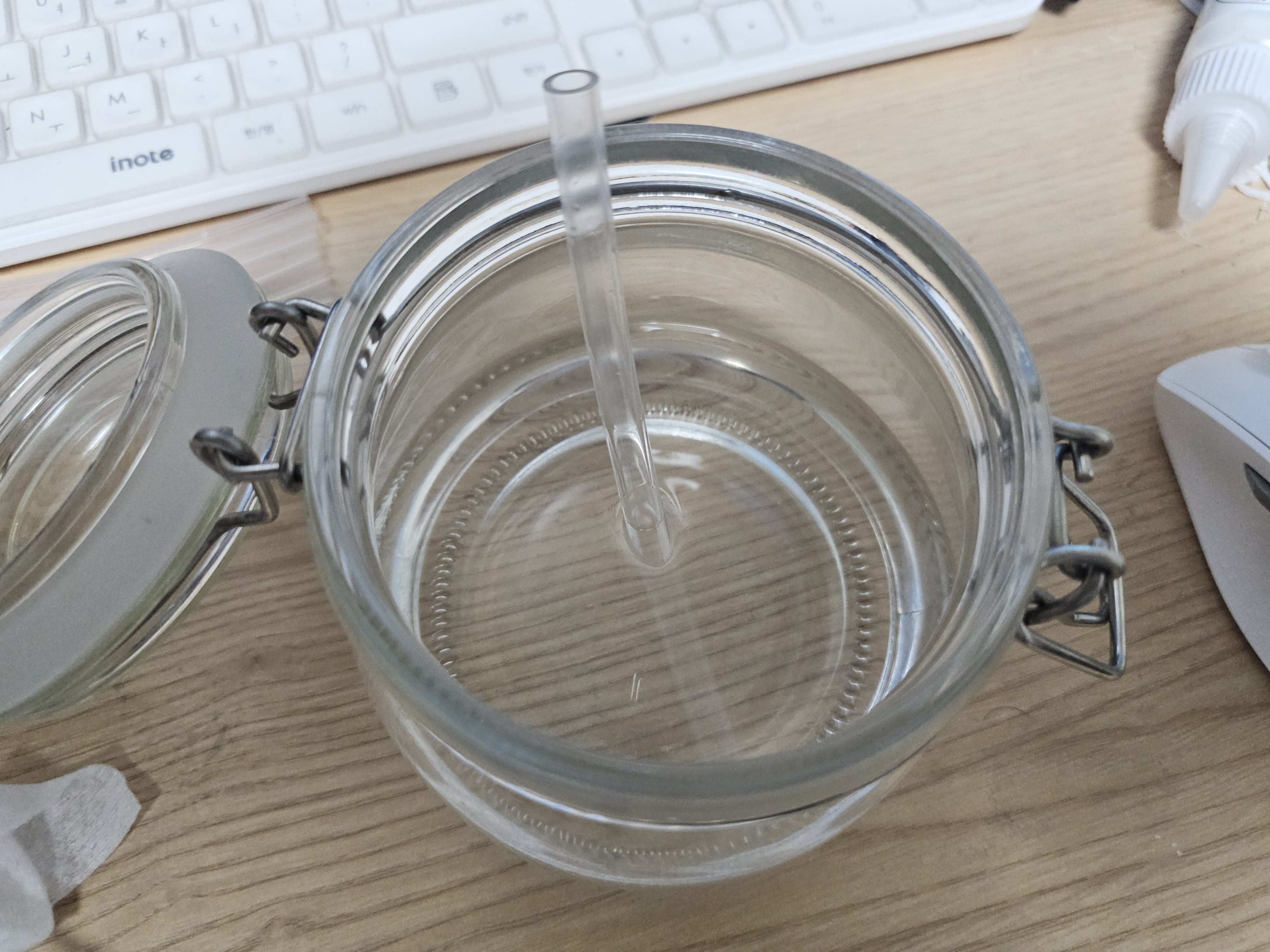 이제 순정 실리콘 튜브와 테프론 튜브를 유리병에 넣고 튜브가 다 잠길 정도의 락커신너를 채워 넣습니다.