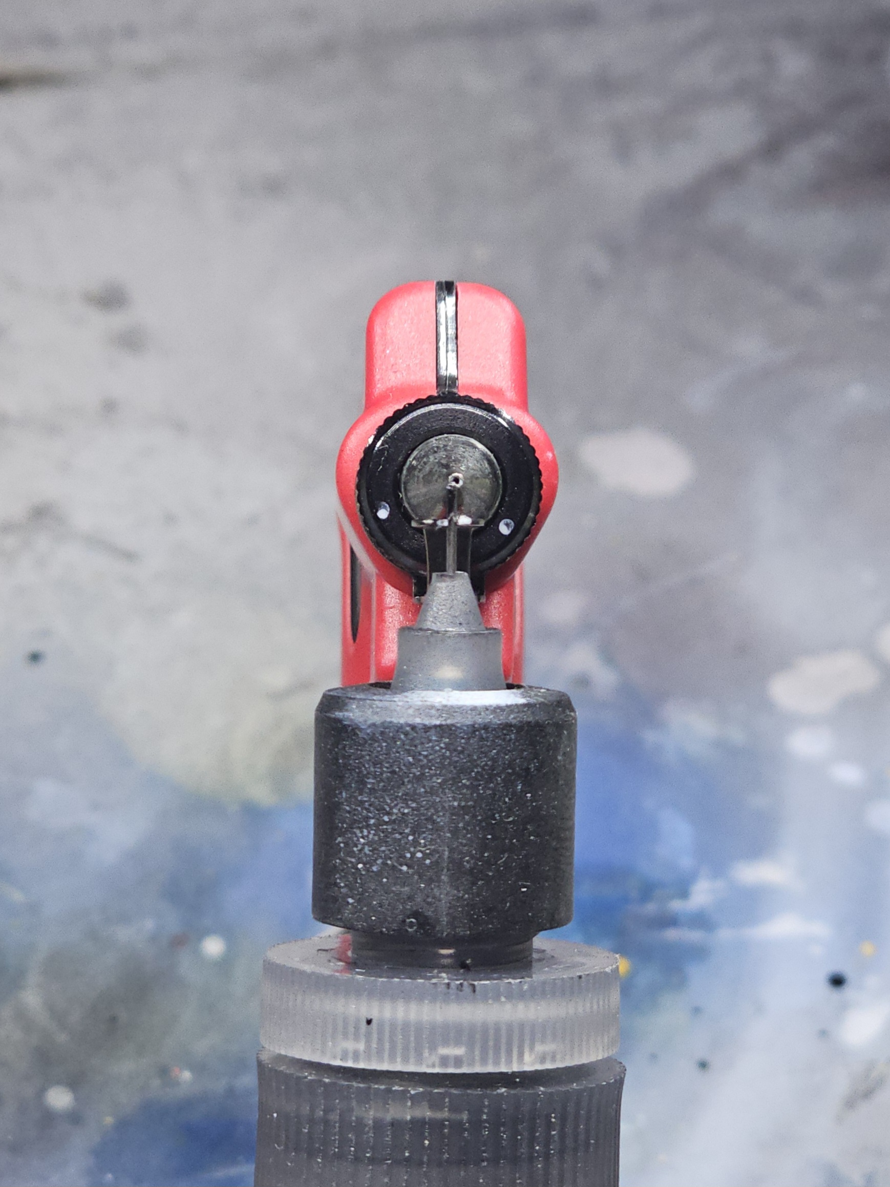 전용 도료병에 니들을 꼽고 니들 고정캡을 씌우긴 하지만, 니들 자체가 강력하게 지정 각도로 고정되는것도 아니며 니들 자체의 수직도가 완벽하게 보장되는 것 또한 아닙니다.