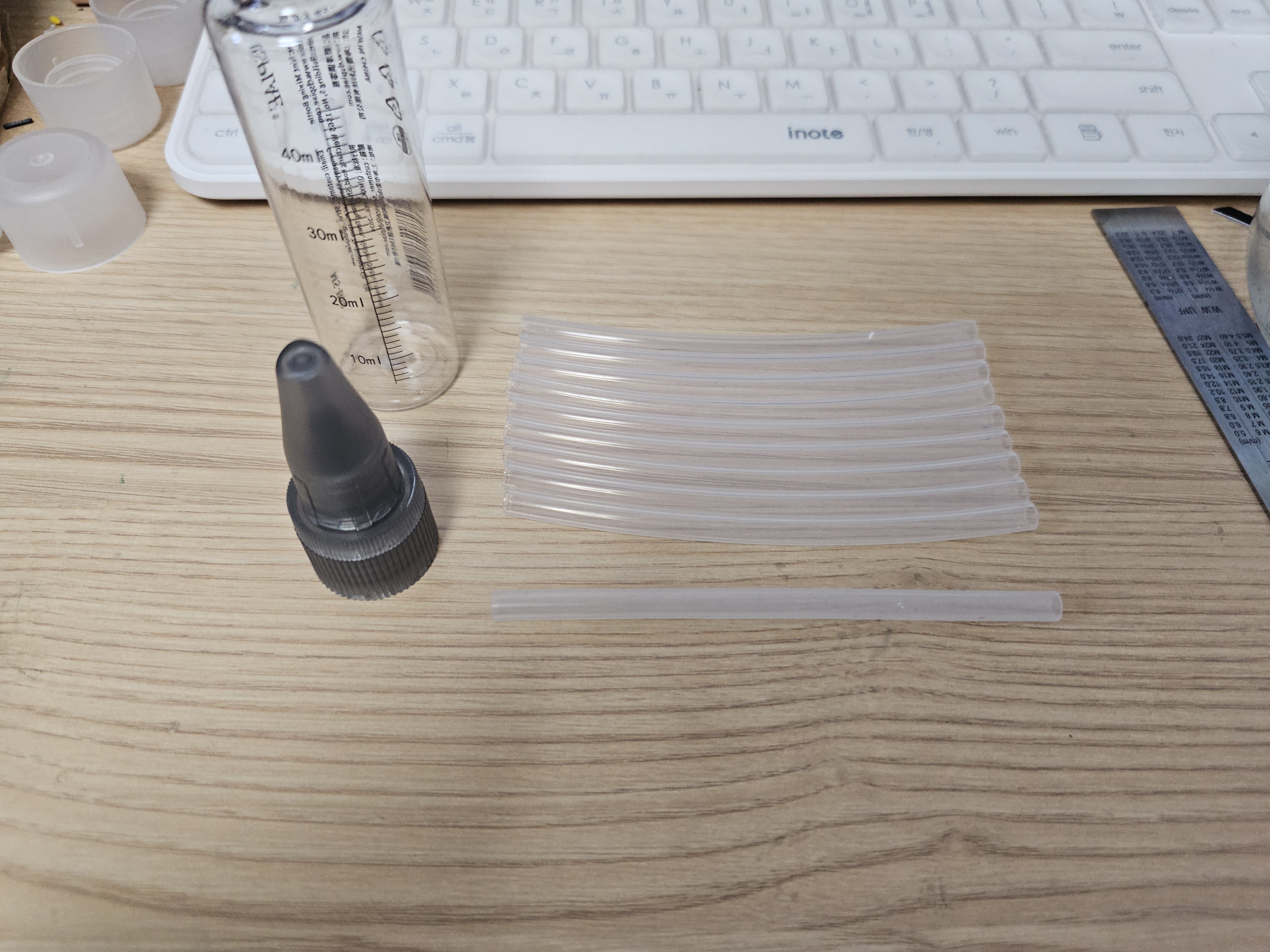 테프론 튜브는 꺼내고, 실리콘 튜브도 반만 꺼내어 병에 걸쳐놓아 봤습니다.