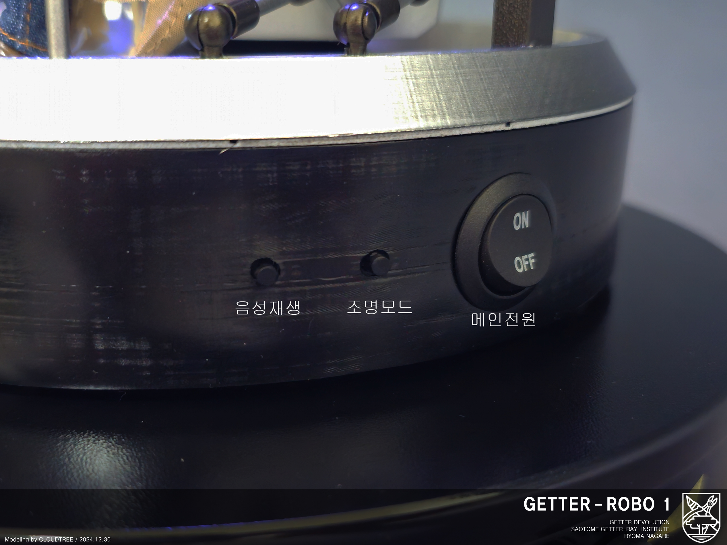 베이스 한쪽에는 메인전원 스위치, 음성재생 버튼, 조명모드 버튼이 있습니다.
