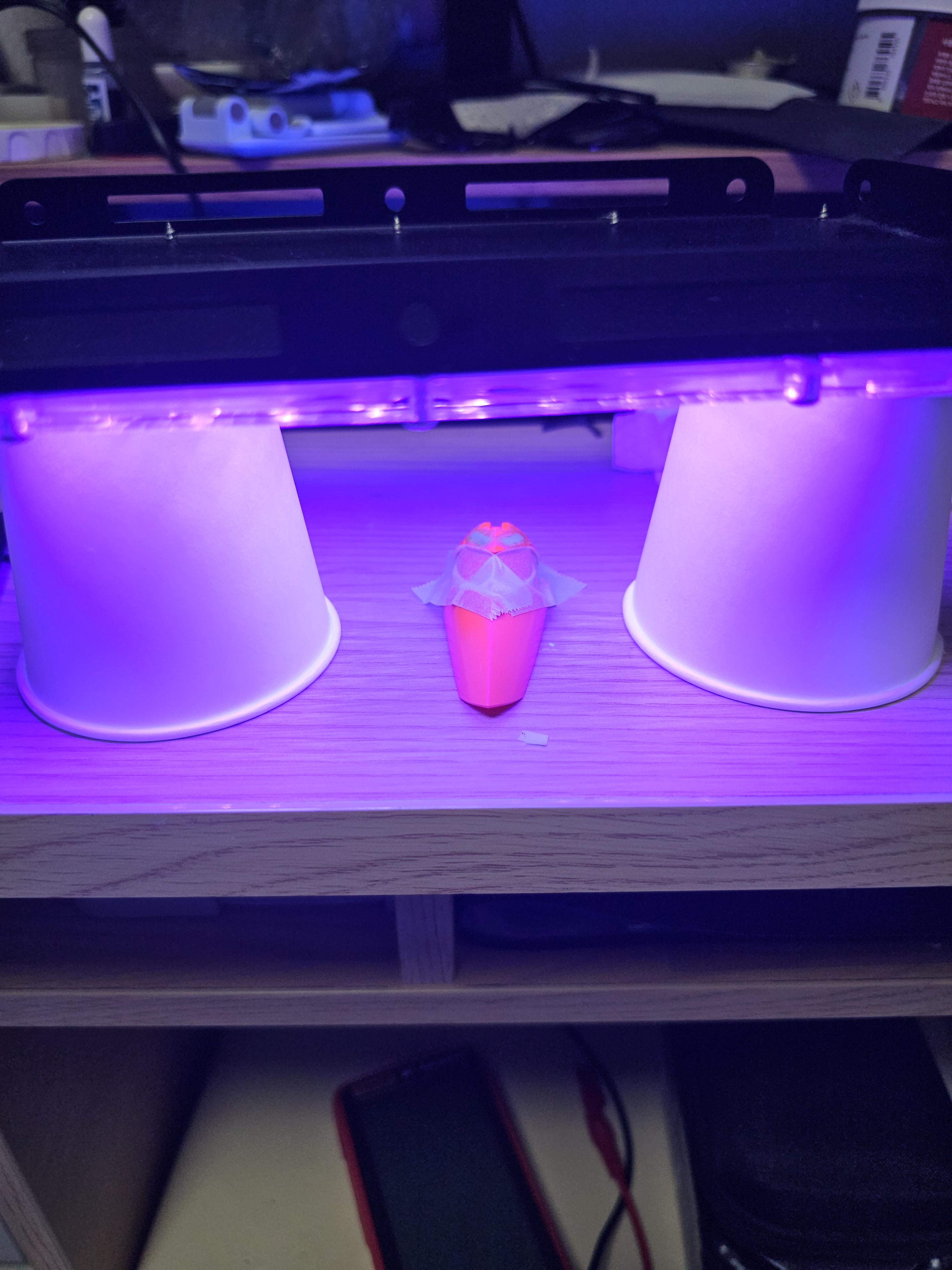 이때는 이번에도 실패인가 했는데, 위에 끈적이는 부품 고정하려고 사용한 양면테잎이었음. 경화 무사히 성공.