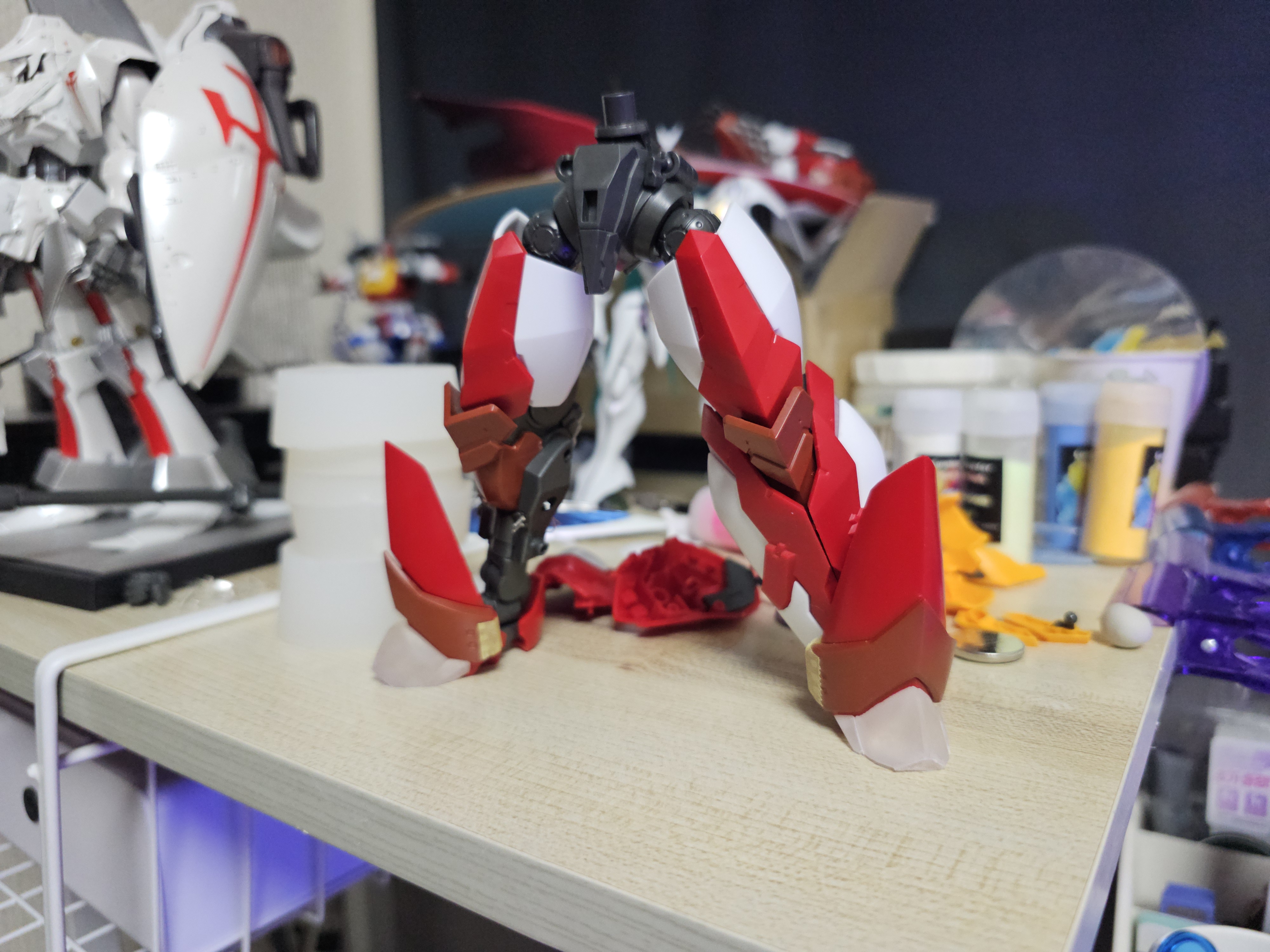 종아리까지 조립 완료. 발 앞꿈치 겸 앵클가드 겸 종아리를 다 가리는 가드 부품을 끼우면 종아리 디테일을 다 가리게 됨.