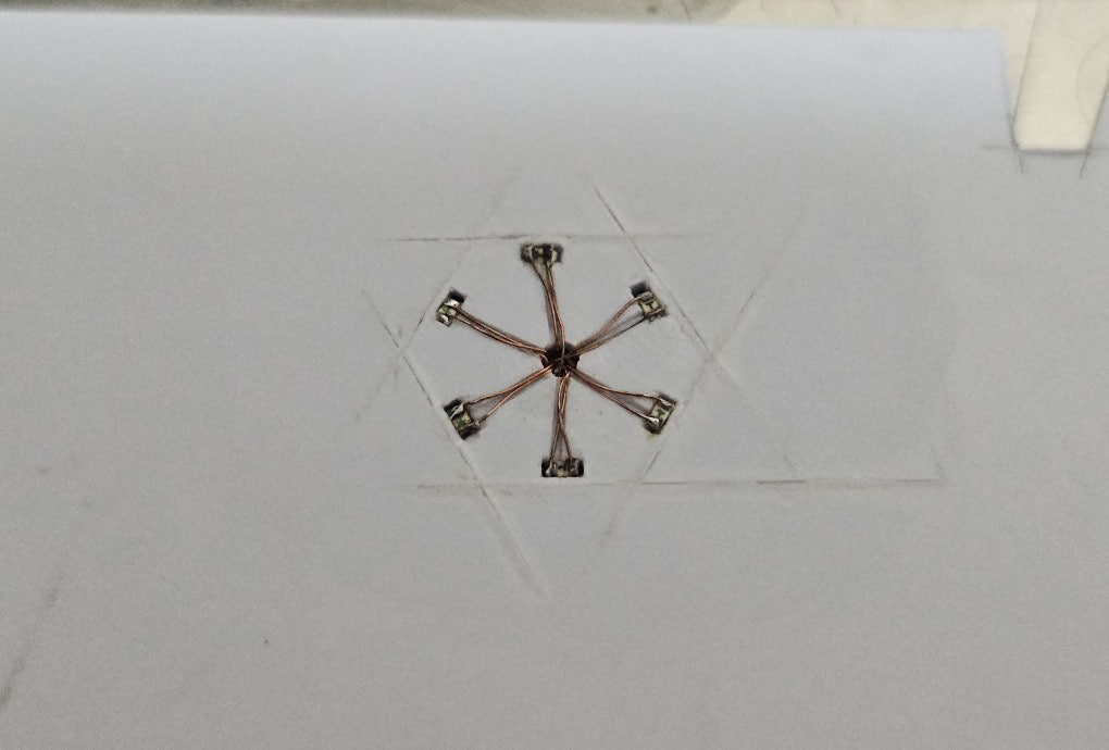 1608 SMD LED를 육각형으로 배치하고 육각기둥 안에 들어갈 배터리를 상정하여 가운데로 배선을 모아줌