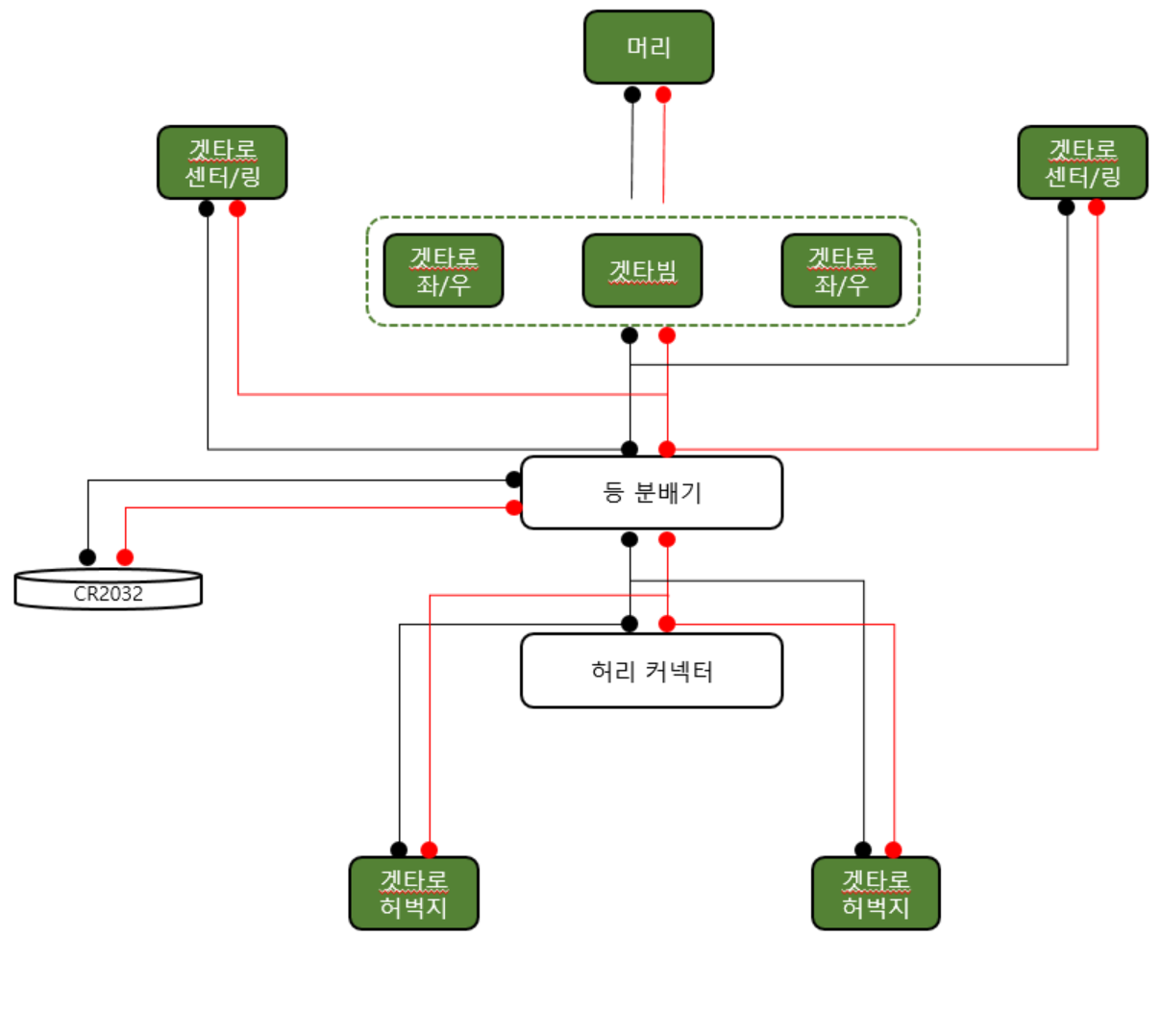 - 계획표에 따라 (몸통중앙부 + 양 어깨 + 머리) - 등 분배기(전원 직결) - 허리 커넥터 - (좌/우 허벅지) 로 전원 연결